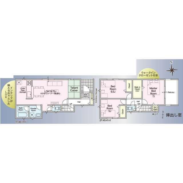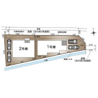 号棟番号:1号棟 角地緩和 容積率:前面道路幅員制限 建物面積に別途ルーフバルコニー約6.48平米有 土地面積に任意後退部分約21.86平米含 カースペース2台(車種による) |